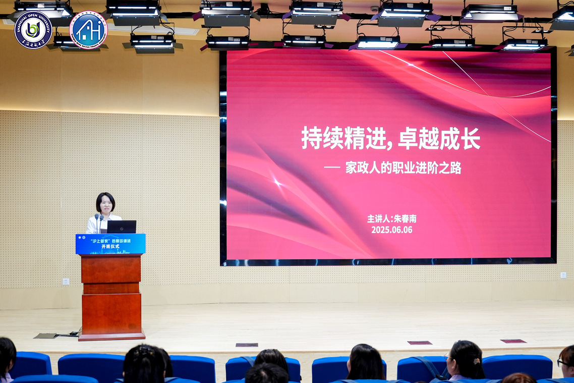 开班仪式后,由获得全国劳动模范称号的家政服务从业者朱春南为学员讲授第一课《持续精进,卓越成长》,正式开启“沪上管家”项目的课程学习。朱春南是上海开放大学2021级首届家政学本科专业毕业生,目前继续在2024级“智慧健康养老服务与管理专业”学习。