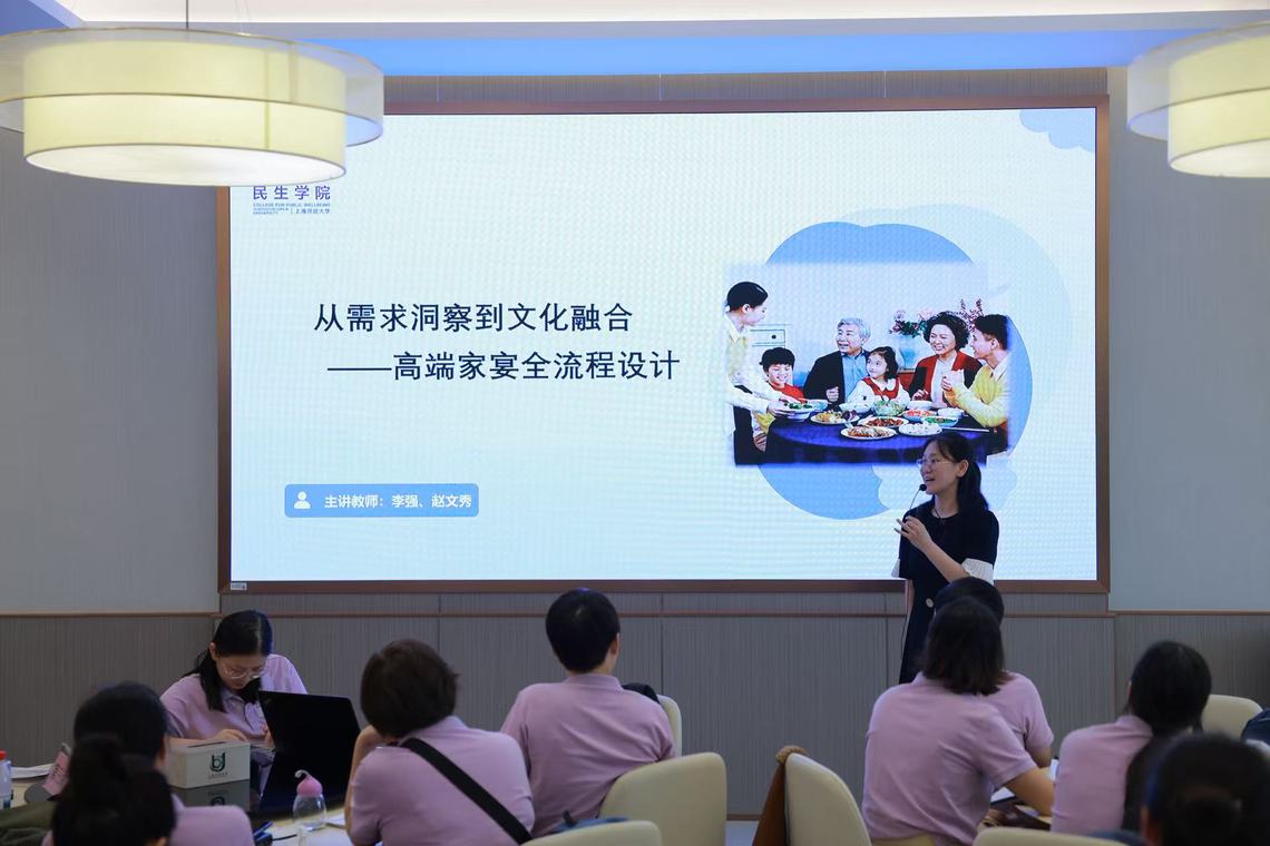 8月23日下午,一场由民生学院教师赵文秀、家政专业行业导师李强共同授课的“高端家宴全流程设计与宴请”培训课在后保处的大力支持下,在国顺校区食堂二楼小餐厅顺利开课,60多位来自民生学院“沪上管家”培训班的学员全神贯注沉浸在教学场景中。